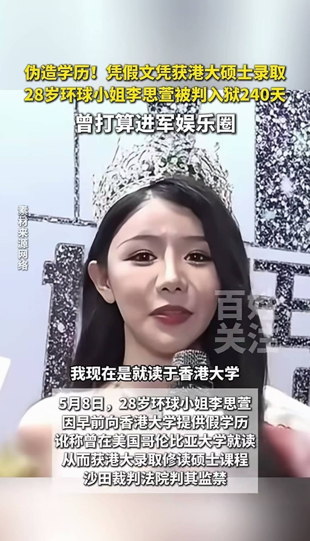 时间拉回2021年12月,李思萱向港大递交申请时,将自己包装成哥大语言学学士。中介机构"学术帝"为其伪造全套文件,包括毕业证、成绩单甚至导师推荐信。港大招生办被这份"完美履历"打动,2022年7月正式发放录取通知书。讽刺的是,她入学后竟不满足于合格成绩,又PS出一张"优秀"毕业证,对虚假光环的追求到了病态地步。 2024年3月,匿名举报揭开骗局。港大联系哥大核实,得到"查无此人"的回复。面对校方约谈要求,李思萱不仅拒绝配合,反而在2025年7月的选美比赛中继续以"港大在读硕士"身份接受采访。直到当月20日,她在落马洲口岸离境时被警方截获,住所搜出多张伪造证书。沙田裁判法院审理时,法官痛斥其"不诚实行为贯穿始终",两罪并罚判处240天监禁。 更令人深思的是涉事中介的逍遥法外。合肥某教育咨询公司股东在法庭承认"伪造学历是行业惯例",却至今正常运营。这场学历造假案撕开了留学圈灰色产业链的冰山一角——当38万就能买到名校入场券,当造假成为"行业潜规则",受损的不仅是教育公平,更是无数寒门学子的奋斗信仰。李思萱用选美冠军的光环和240天刑期证明:所有走捷径的人生,最终都会在终点偿还代价。